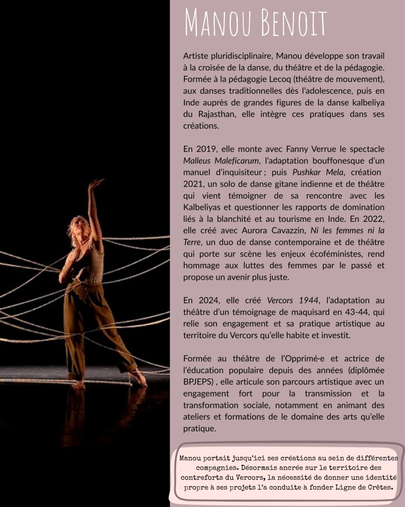 La compagnie Ligne de Crêtes a été créée en 2025 pour rassembler et porter les projets artistiques de Manou Benoit, artiste de danse et de théâtre qui explore des formes hybrides. Installée au pied du Vercors, elle propose des spectacles qui questionnent et reflètent le monde avec ses problématiques sociétales et ses contradictions, quelque part entre le documentaire et la poésie.
